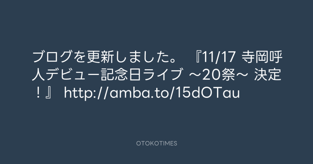 ブログを更新しました。 『11/17 寺岡呼人デビュー記念日ライブ ~20祭~ 決定!』...