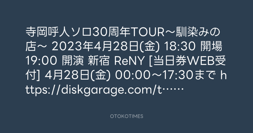 寺岡呼人ソロ30周年TOUR〜馴染みの店〜 2023年4月28日(金) 18:30 開場 19:00 開演 ... -