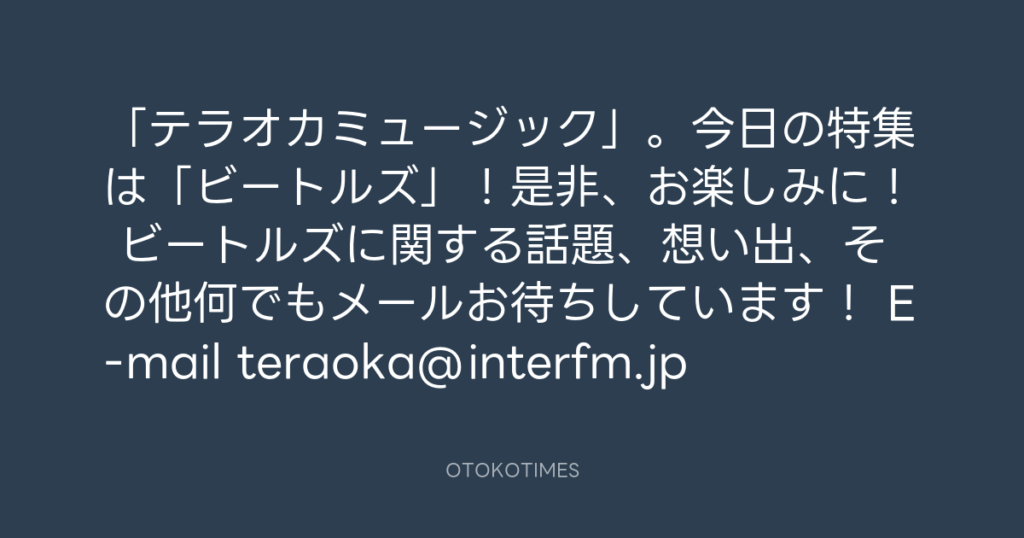 「テラオカミュージック」。今日の特集は「ビートルズ」!是非、お楽しみに! ビー... -