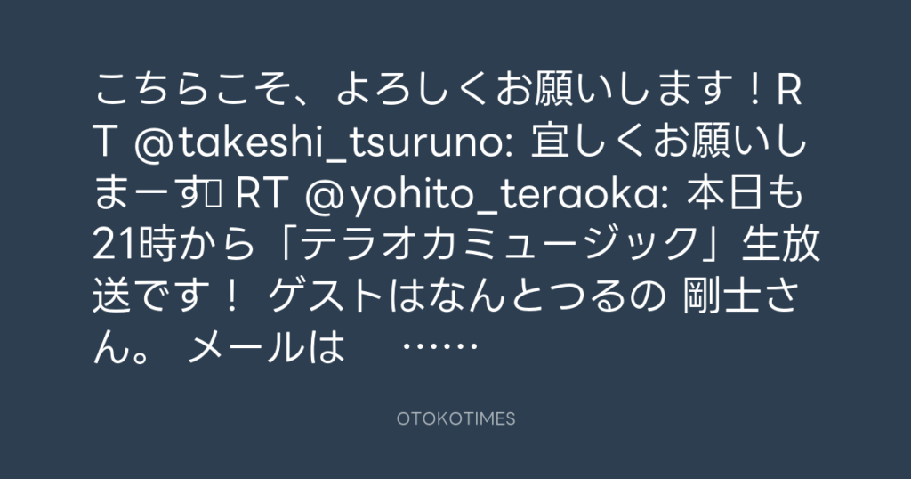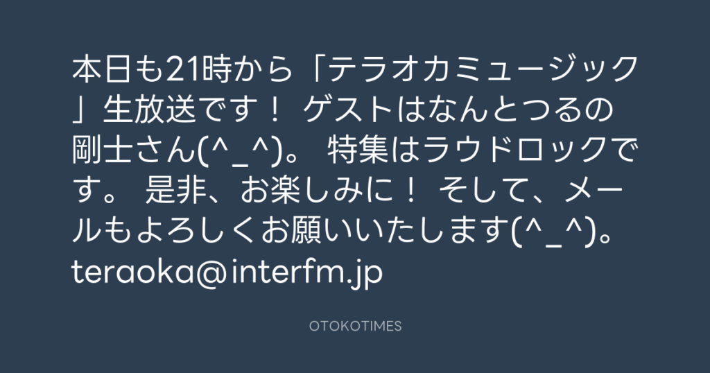 本日も21時から「テラオカミュージック」生放送です! ゲストはなんとつるの 剛士...
