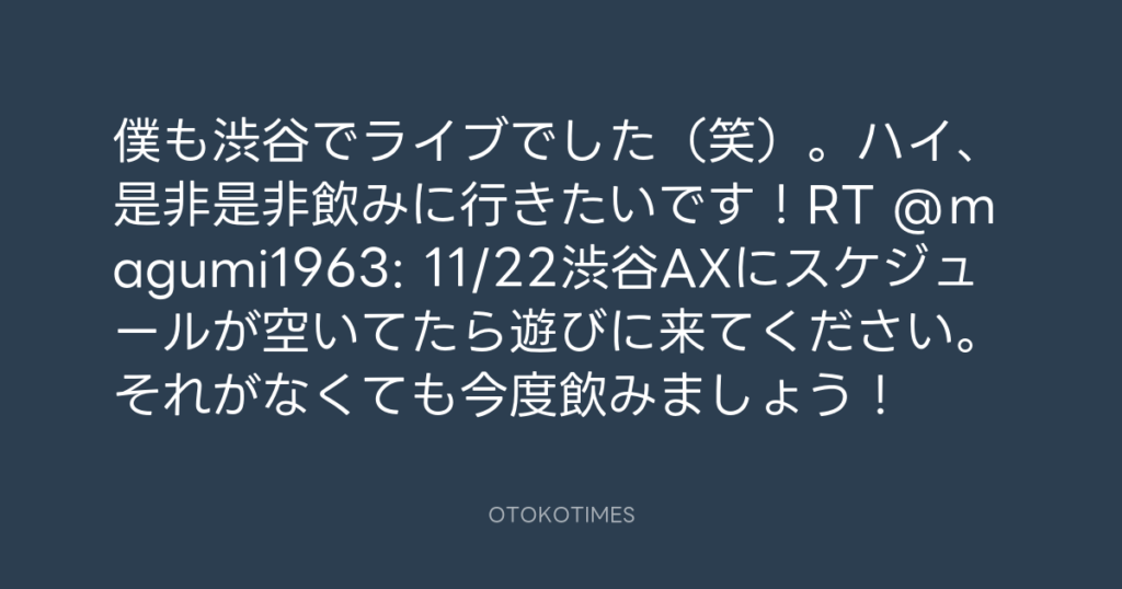 僕も渋谷でライブでした(笑)。ハイ、是非是非飲みに行きたいです!RT @magumi196... -