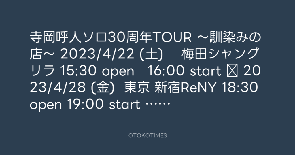 寺岡呼人ソロ30周年TOUR 〜馴染みの店〜 2023/4/22 (土) 梅田シャングリラ 15:... -