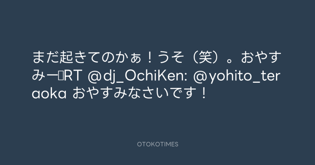 まだ起きてのかぁ!うそ(笑)。おやすみー☆RT @dj_OchiKen: @yohito_teraoka おや...