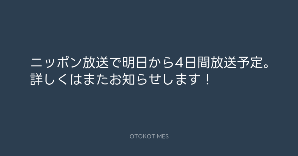 ニッポン放送で明日から4日間放送予定。詳しくはまたお知らせします!