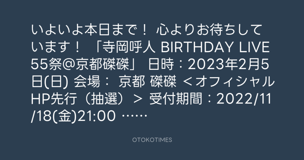 いよいよ本日まで! 心よりお待ちしています! 「寺岡呼人 BIRTHDAY LIVE 55祭@京... -