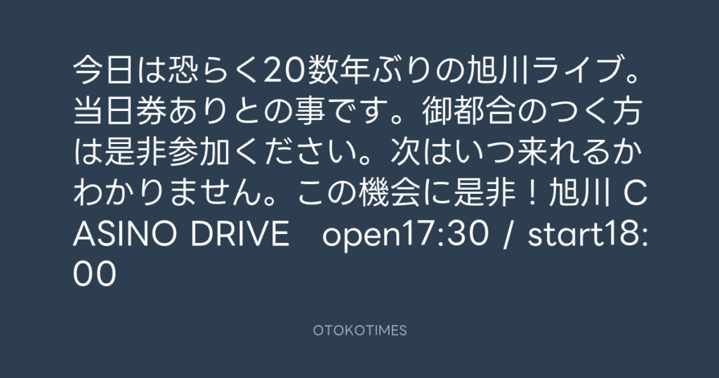 今日は恐らく20数年ぶりの旭川ライブ。当日券ありとの事です。御都合のつく方は是... -