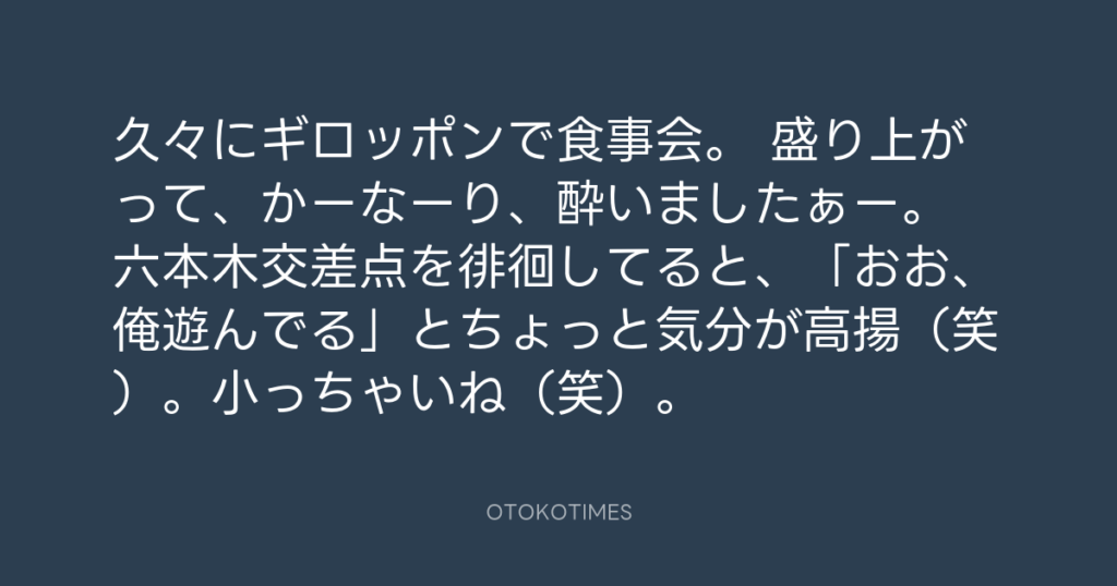 久々にギロッポンで食事会。 盛り上がって、かーなーり、酔いましたぁー。 六本木... -