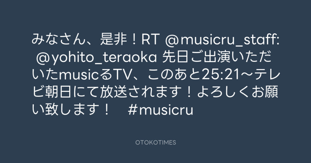 みなさん、是非!RT @musicru_staff: @yohito_teraoka 先日ご出演いただいたmusic... -