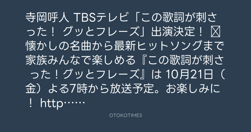 寺岡呼人 TBSテレビ「この歌詞が刺さった! グッとフレーズ」出演決定! 懐かし... -