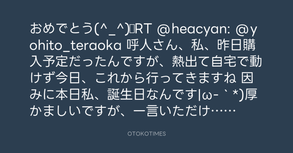 おめでとう(^_^)☆RT @heacyan: @yohito_teraoka 呼人さん、私、昨日購入予定だった... -