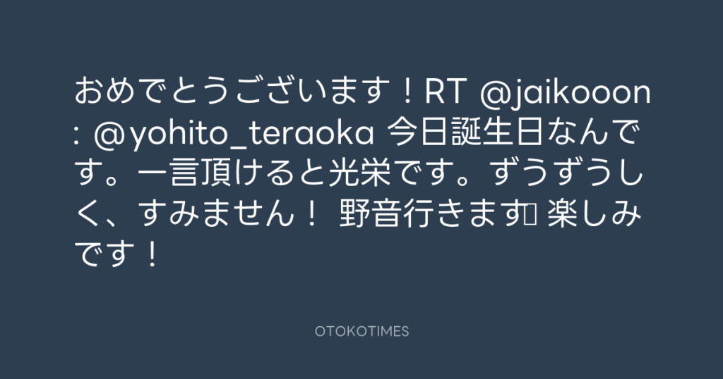 おめでとうございます!RT @jaikooon: @yohito_teraoka 今日誕生日なんです。一言... -