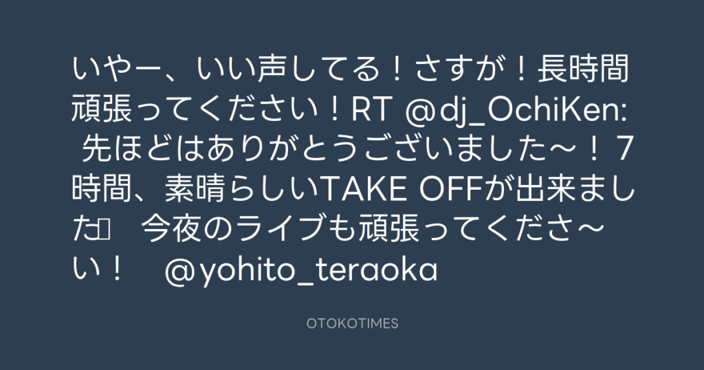 いやー、いい声してる!さすが!長時間頑張ってください!RT @dj_OchiKen: 先ほど... -