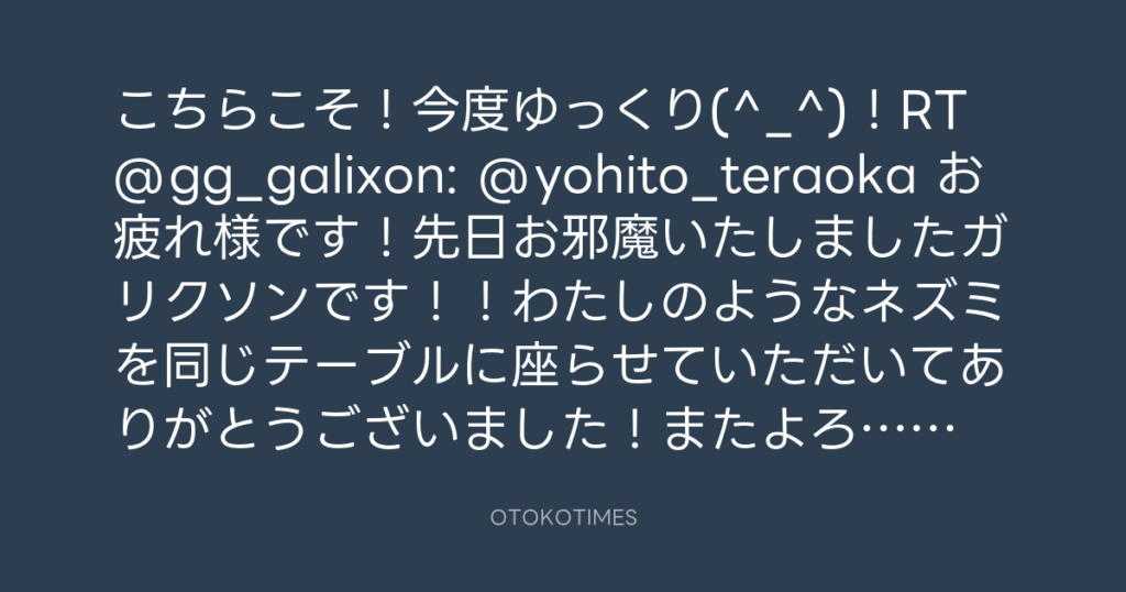 こちらこそ!今度ゆっくり(^_^)!RT @gg_galixon: @yohito_teraoka お疲れ様です!... -