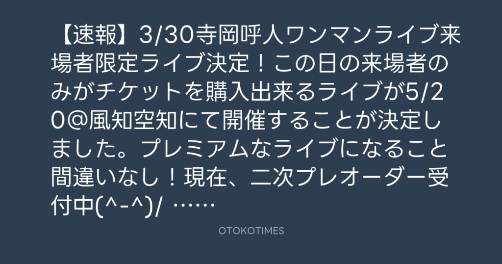 【速報】3/30寺岡呼人ワンマンライブ来場者限定ライブ決定!この日の来場者のみが... -