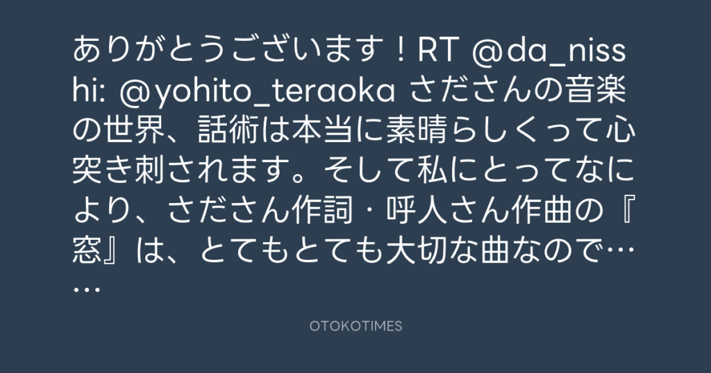 ありがとうございます!RT @da_nisshi: @yohito_teraoka さださんの音楽の世界、話... -