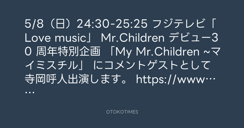 5/8(日)24:30-25:25 フジテレビ「Love music」 Mr.Children デビュー30 周年特別... -
