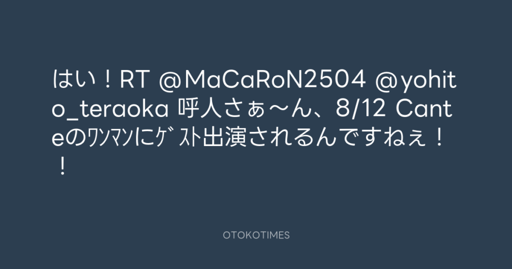 はい!RT @MaCaRoN2504 @yohito_teraoka 呼人さぁ〜ん、8/12 Canteのワンマンにゲスト出...