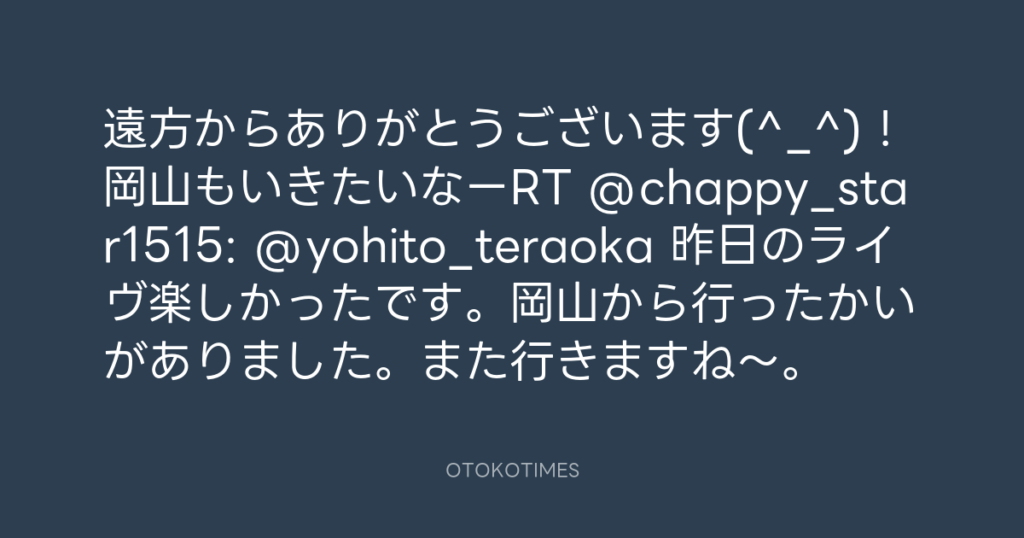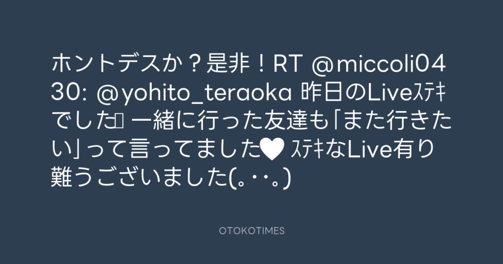 ホントデスか?是非!RT @miccoli0430: @yohito_teraoka 昨日のLiveステキでした♬ 一...