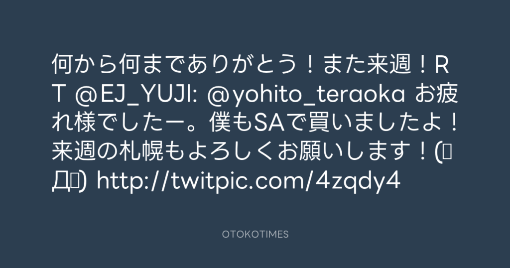何から何までありがとう!また来週!RT @EJ_YUJI: @yohito_teraoka お疲れ様でした... -