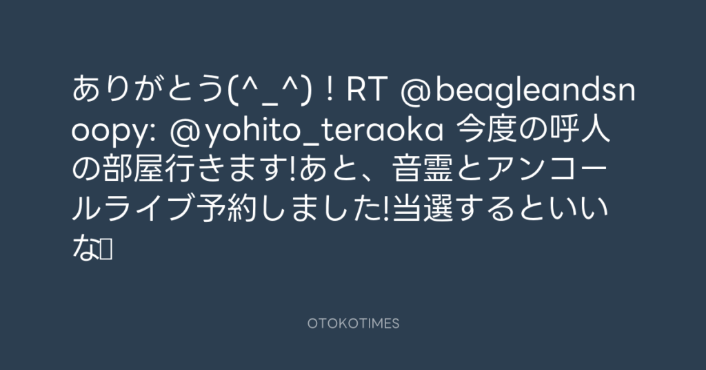 ありがとう(^_^)!RT @beagleandsnoopy: @yohito_teraoka 今度の呼人の部屋行きま... -