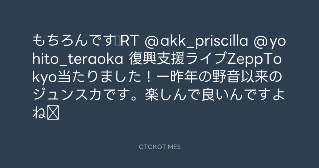 もちろんです♫RT @akk_priscilla @yohito_teraoka 復興支援ライブZeppTokyo当たり... -
