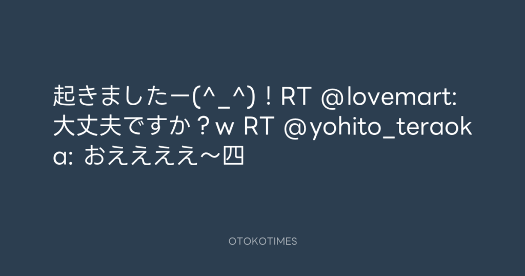 起きましたー(^_^)!RT @lovemart: 大丈夫ですか?w RT @yohito_teraoka: おえええ... -