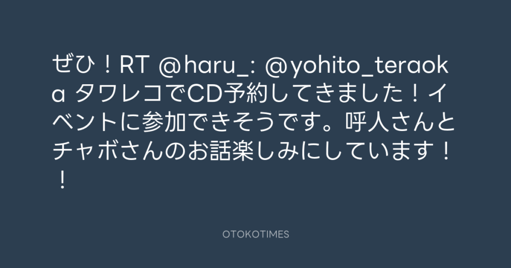 ぜひ!RT @haru_: @yohito_teraoka タワレコでCD予約してきました!イベントに参加... -