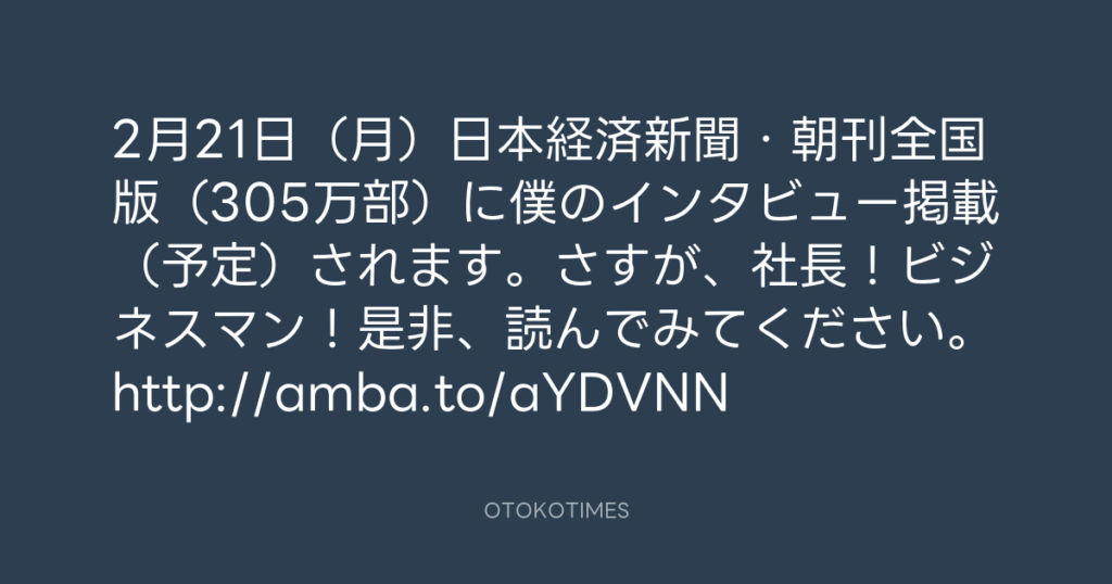 2月21日(月)日本経済新聞・朝刊全国版(305万部)に僕のインタビュー掲載(予定...