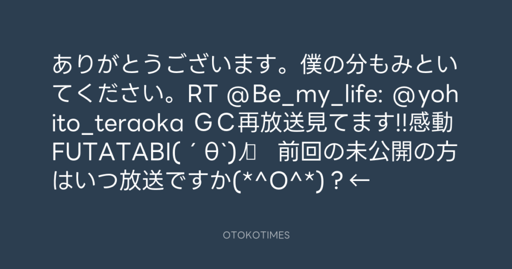 ありがとうございます。僕の分もみといてください。RT @Be_my_life: @yohito_terao... -