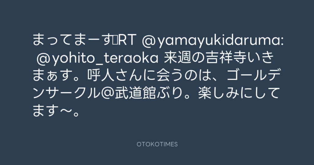 まってまーす♪RT @yamayukidaruma: @yohito_teraoka 来週の吉祥寺いきまぁす。呼人... -