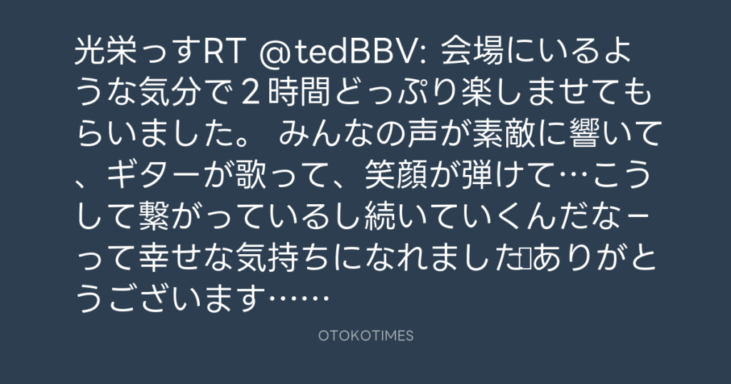光栄っすRT @tedBBV: 会場にいるような気分で2時間どっぷり楽しませてもらいまし... -