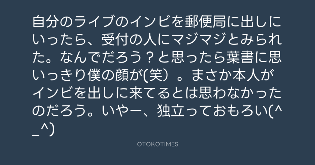 自分のライブのインビを郵便局に出しにいったら、受付の人にマジマジとみられた。... -