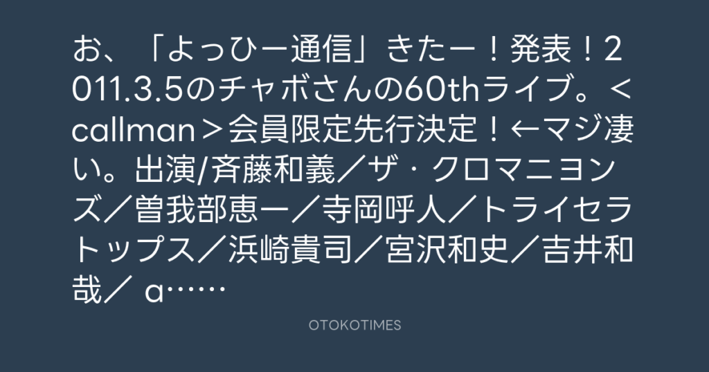お、「よっひー通信」きたー!発表!2011.3.5のチャボさんの60thライブ。<callman...