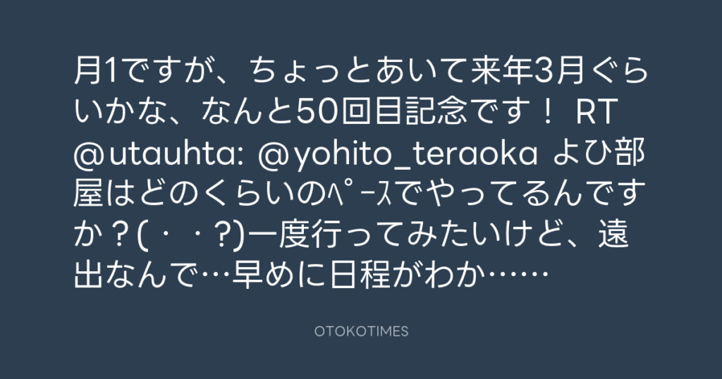 月1ですが、ちょっとあいて来年3月ぐらいかな、なんと50回目記念です! RT @utauht... -