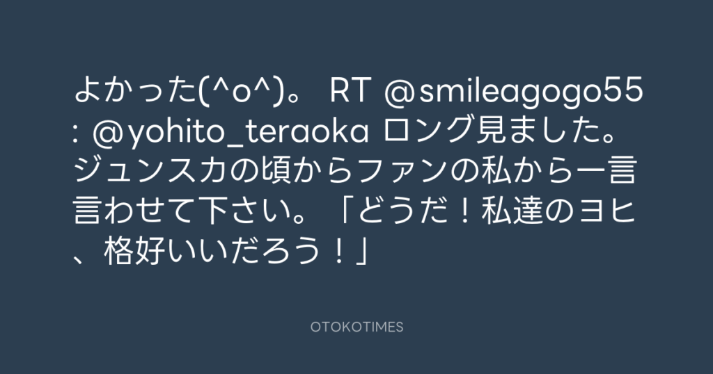 よかった(^o^)。 RT @smileagogo55: @yohito_teraoka ロング見ました。ジュンスカ... -