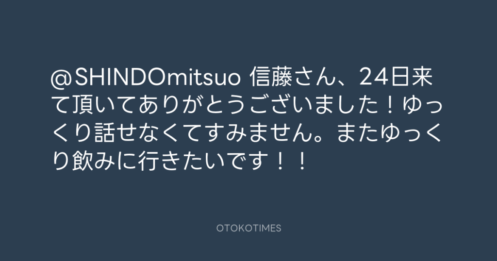 @SHINDOmitsuo 信藤さん、24日来て頂いてありがとうございました!ゆっくり話せな...