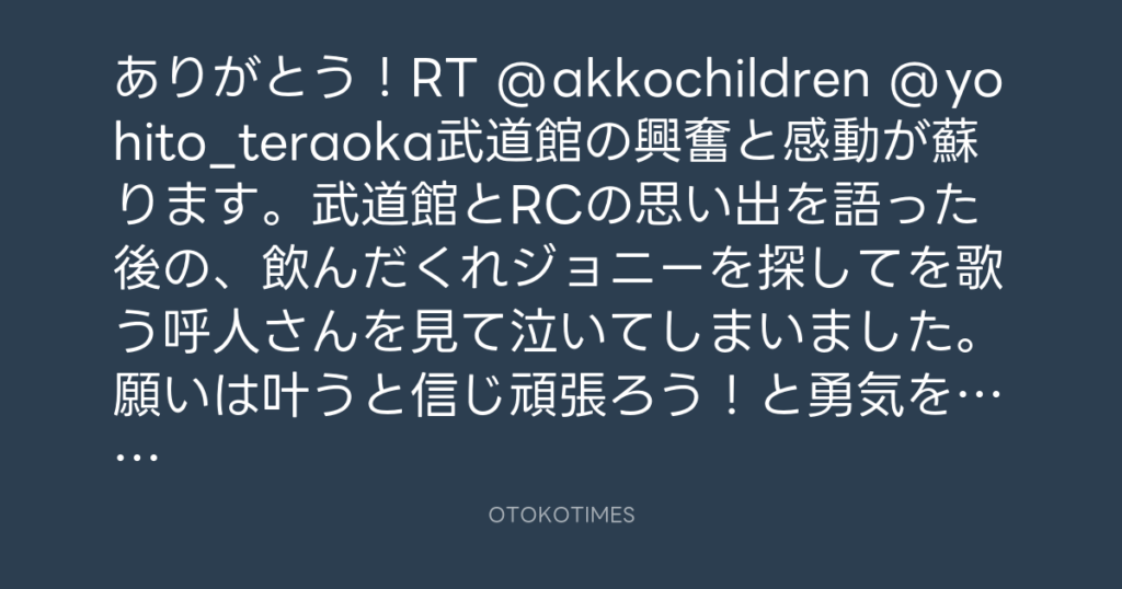 ありがとう!RT @akkochildren @yohito_teraoka武道館の興奮と感動が蘇ります。武... -