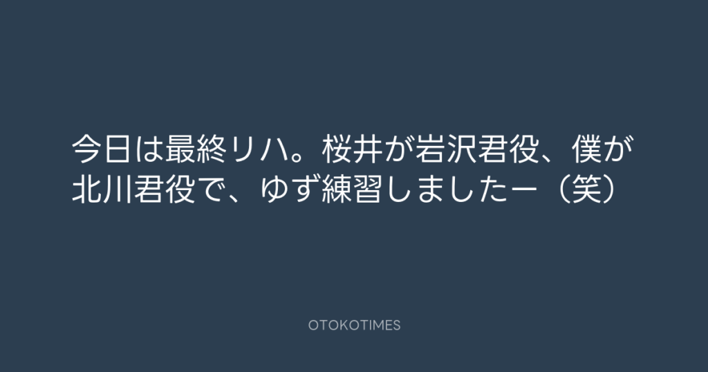 今日は最終リハ。桜井が岩沢君役、僕が北川君役で、ゆず練習しましたー(笑) -