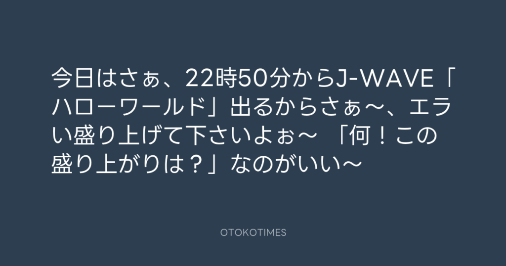 今日はさぁ、22時50分からJ-WAVE「ハローワールド」出るからさぁ〜、エラい盛り上... -
