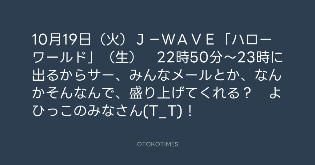 10月19日(火)J-WAVE「ハローワールド」(生) 22時50分~23時に出るから... -