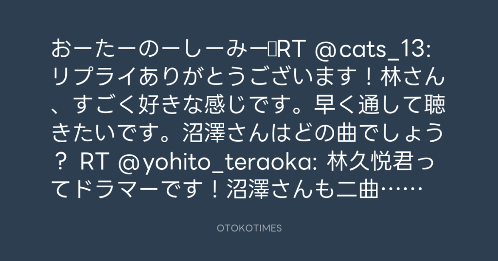 おーたーのーしーみー♪RT @cats_13: リプライありがとうございます!林さん、すご...
