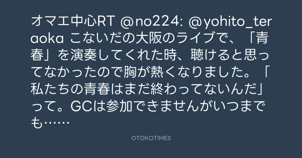 オマエ中心RT @no224: @yohito_teraoka こないだの大阪のライブで、「青春」を演奏...
