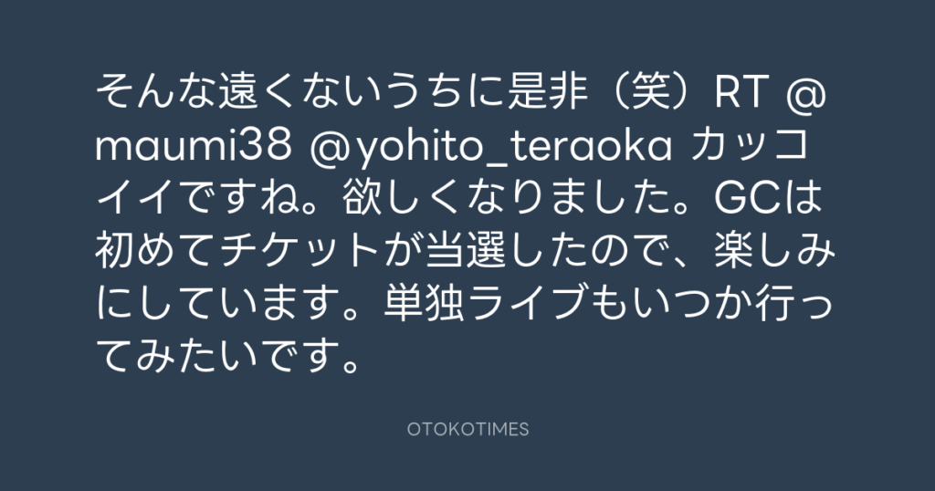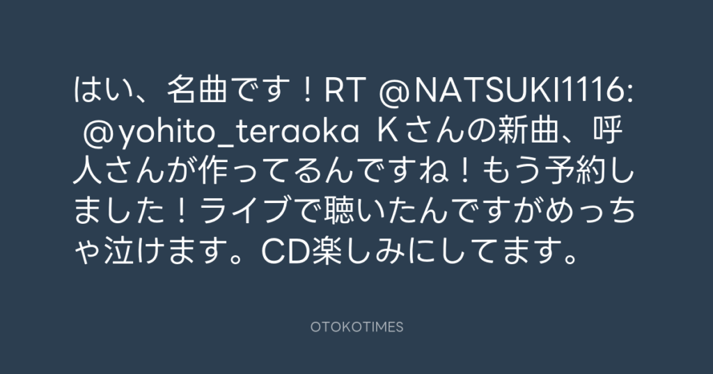 はい、名曲です!RT @NATSUKI1116: @yohito_teraoka Kさんの新曲、呼人さんが作っ... -