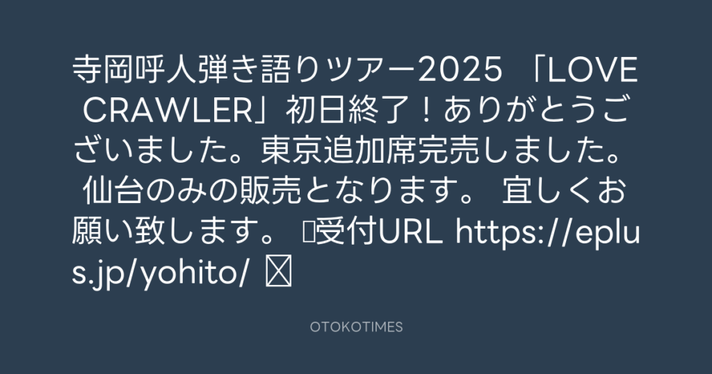 寺岡呼人弾き語りツアー2025 「LOVE CRAWLER」 一般発売(仙台公演のみ) 大阪、東... -