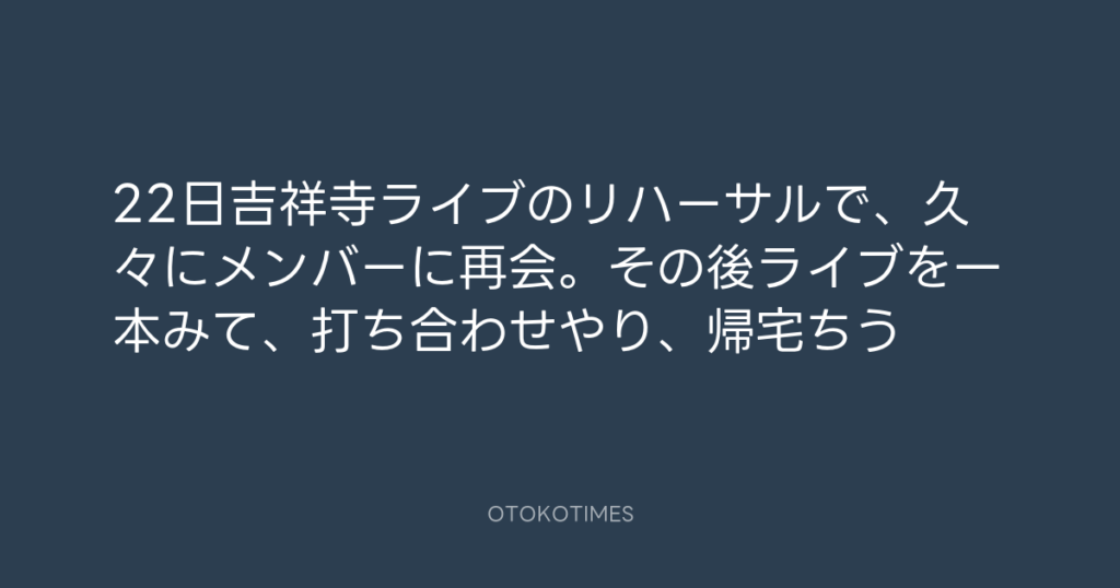 22日吉祥寺ライブのリハーサルで、久々にメンバーに再会。その後ライブを一本みて... -