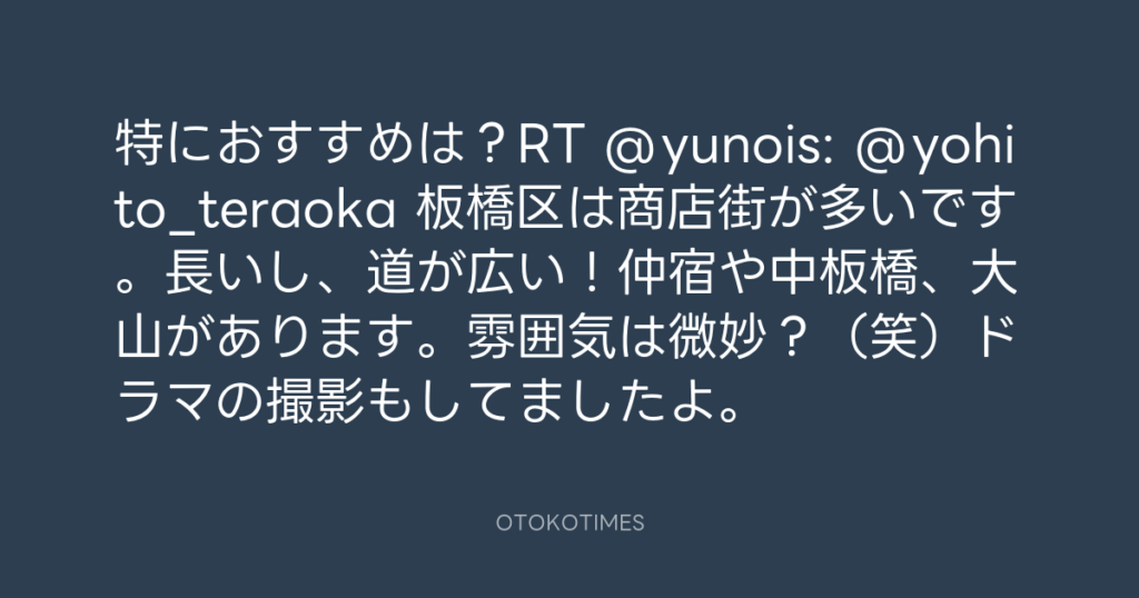 特におすすめは?RT @yunois: @yohito_teraoka 板橋区は商店街が多いです。長いし... -