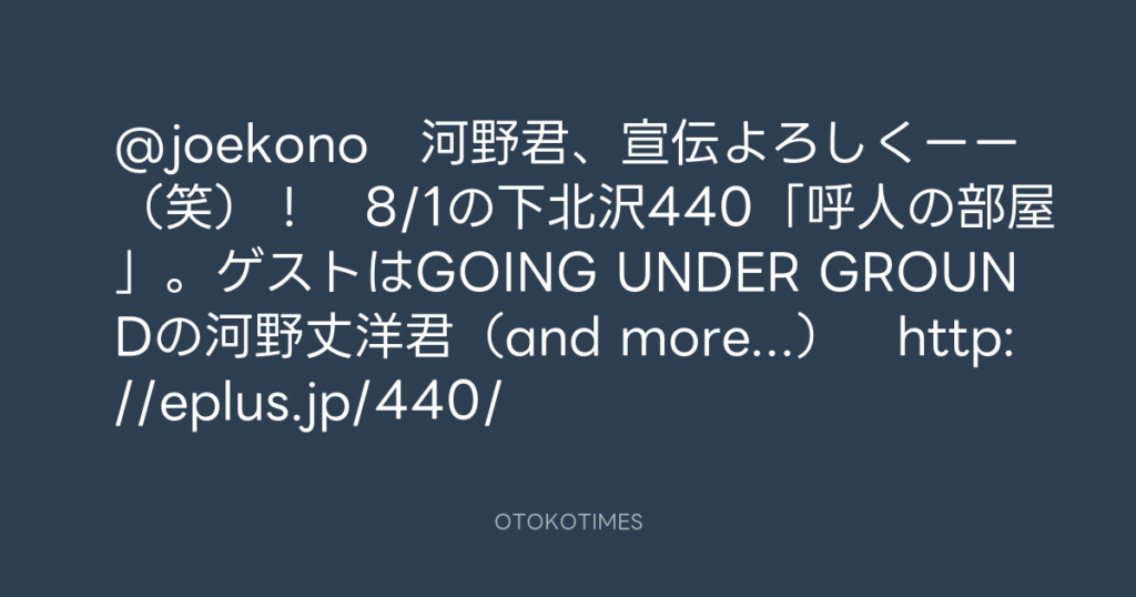 @joekono 河野君、宣伝よろしくーー(笑)! 8/1の下北沢440「呼人の部屋」。ゲ...