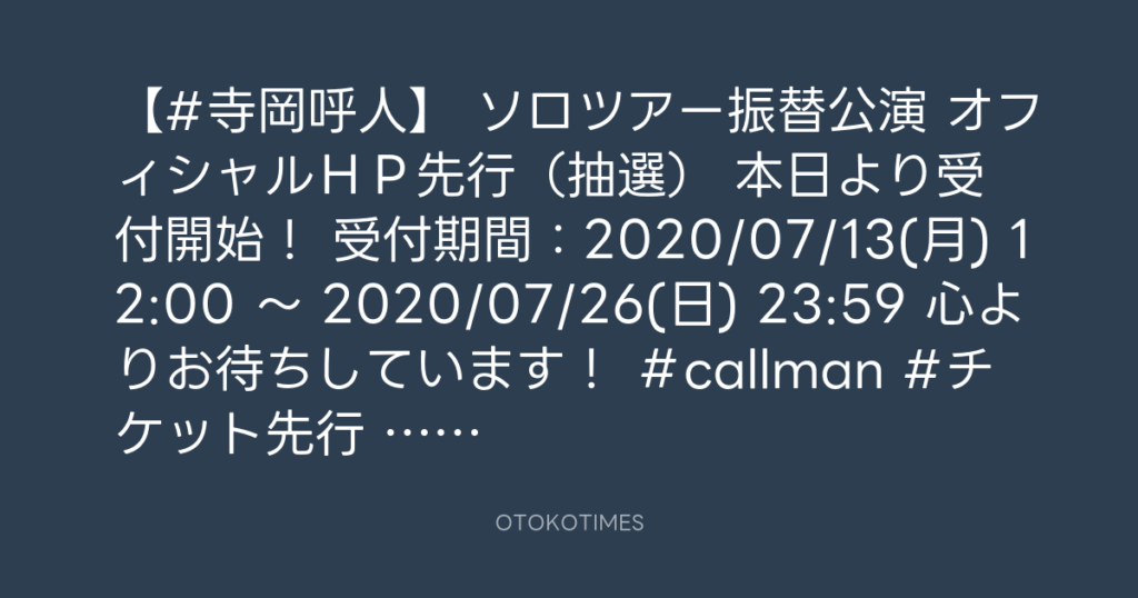 【#寺岡呼人】 ソロツアー振替公演 オフィシャルHP先行(抽選) 本日より受付開...
