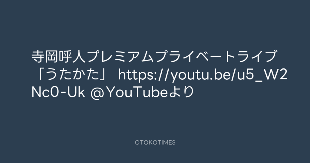 寺岡呼人プレミアムプライベートライブ「うたかた」 https://youtu.be/u5_W2Nc0-Uk... -