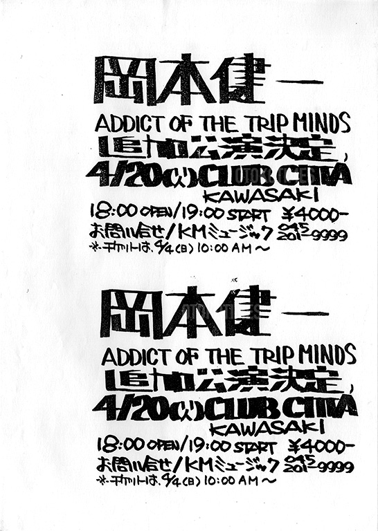 CLUB CITTA’川崎 LIVE 1993-04-20 LIVE CLUB CITTA’川崎 1993年4月20日(火) 19:00 CLUB CITTA’川崎 ADDICT OF THE TRIP MINDS 当時の告知チラシ ADDICT OF THE TRIP MINDS 岡本健一 \ よかったらシェアしてね! / Prev1988.08.24 男闘呼組デビュー日 1993.06.02「Club ADDICT」西麻布YELLOWNext 関連記事 ADDICT OF THE TRIP MINDS 1993-10-01 岡本健一 1969-05-21 更新ログ 岡本健一 @kenichi.okamoto – 17:50・2021年11月23日